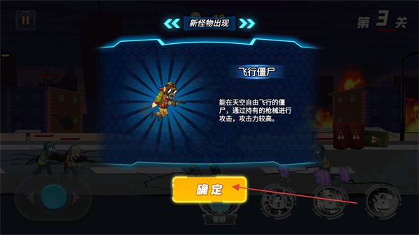 2、点击确定,了解飞行僵尸属性,其能空中飞行、攻击力高,做好战斗准备。