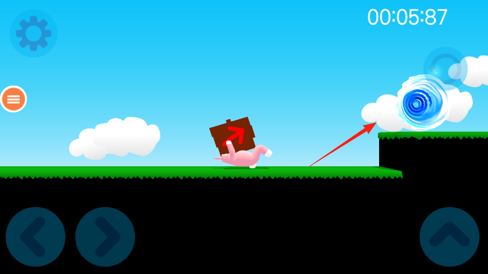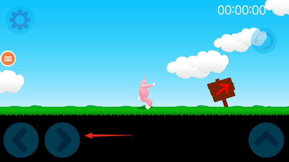 1、进入超级兔子人游戏,选择粉色兔子角色,在草地场景中通过方向控制按钮左右移动,遇到障碍时点击向上箭头按钮跳跃,借助箭头指示牌指引前进方向。