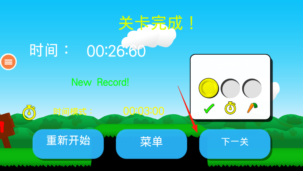 3、关卡结束后,可根据需求点击重新开始按钮再次挑战,或选择菜单按钮返回主界面,也能点击下一关按钮进入新关卡,界面还显示金币计时胡萝卜等评价图标。