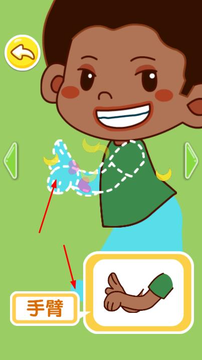 1、部位的点击识别:点击屏幕上的身体部位图案,触发清晰的名称播报与生动的动画展示,直观认识部位的名称、位置及外观特征。