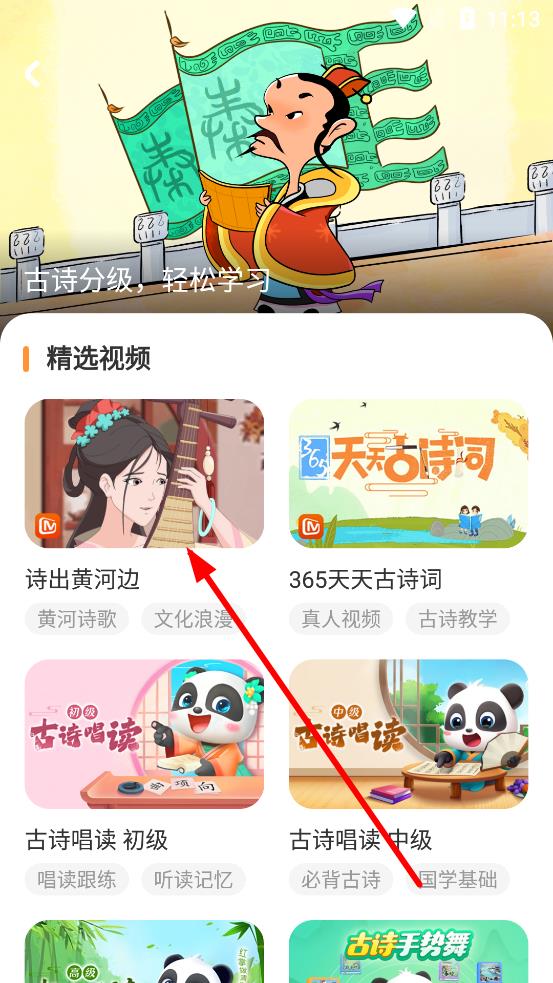 3、进入古诗页面后,在精选视频板块,选择喜欢的古诗视频或唱读内容,点击即可播放收听。
