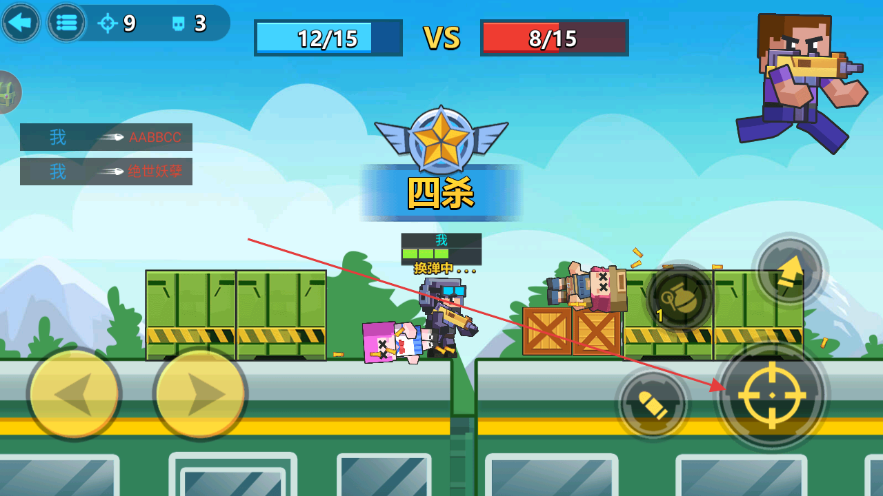 1、操控角色移动,点击攻击按钮瞄准敌方射击,积累击杀数缩小比分差距。