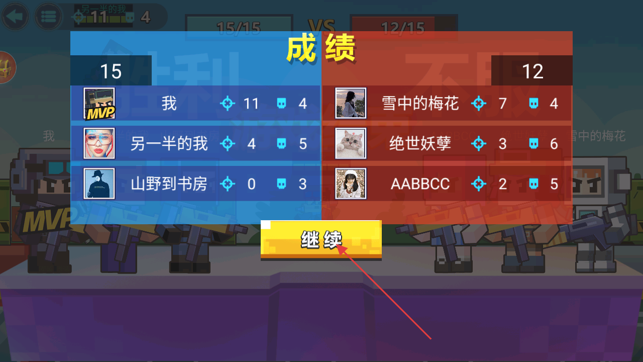 4、达成击杀目标后,点击继续结算战绩,推进游戏进程。