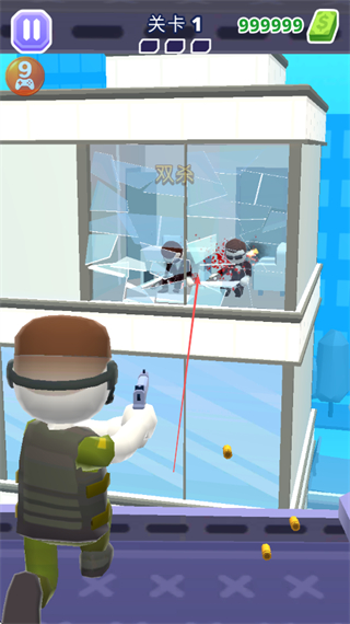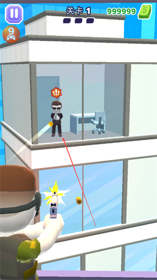 2、瞄准建筑内的敌人如戴墨镜的黑衣人,发射子弹击碎玻璃,击中敌人将其消灭。