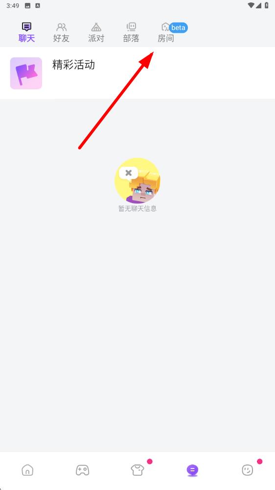 1、打开方块堡垒游戏,进入游戏界面点击下方消息图标后点击上方导航栏中的房间选项,进入房间相关页面。
