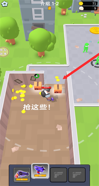 1、操控角色移动到标有抢这些的区域,收集该区域内的金币等资源,为后续战斗积累必要的物资储备。
