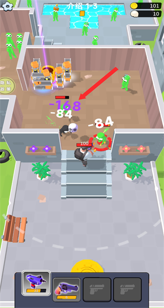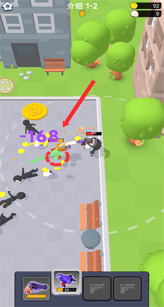 2、操控使用当前武器攻击黑色丧尸,战斗中留意数值变化,及时拾取附近金币补充资源,维持战斗状态。