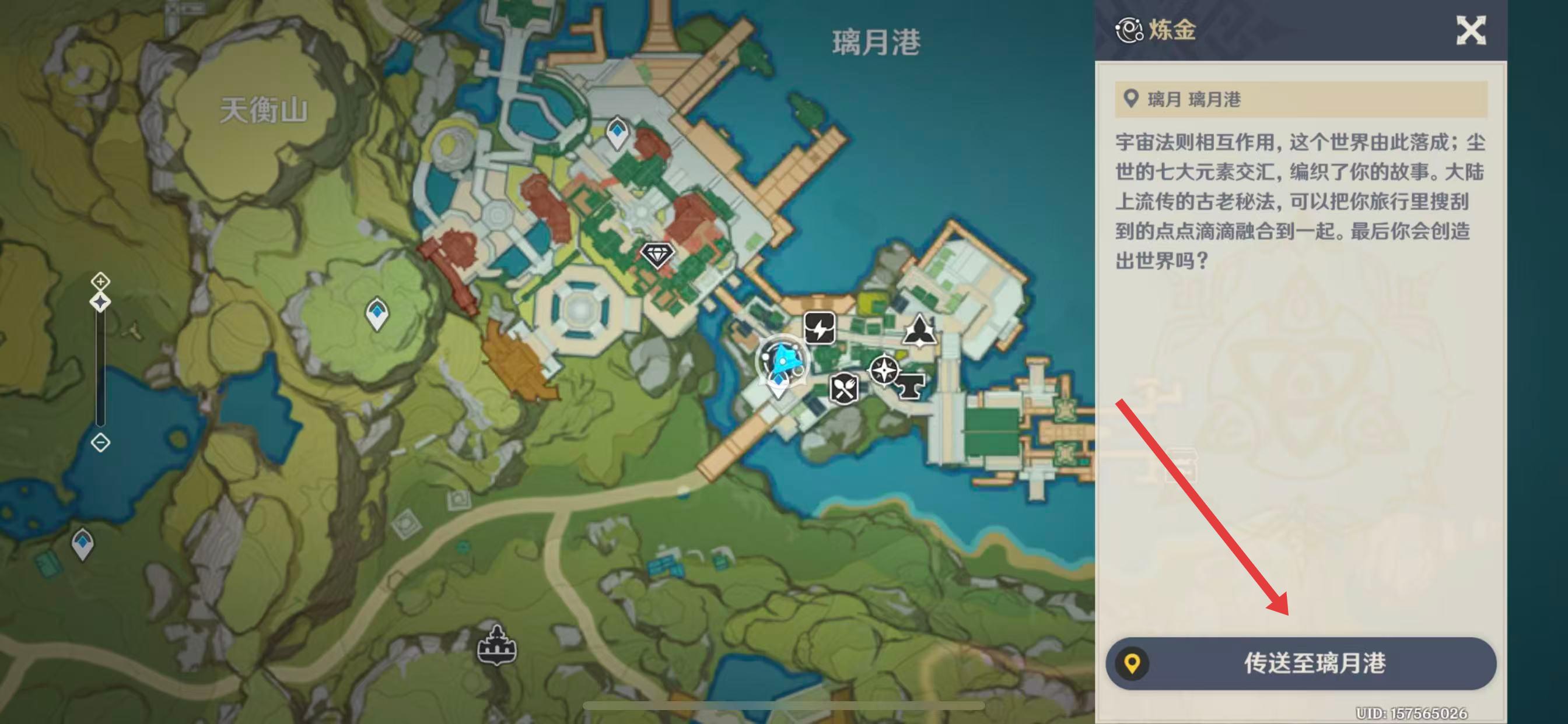 1、打开地图,点击传送至对应地点,如璃月港的炼金台。