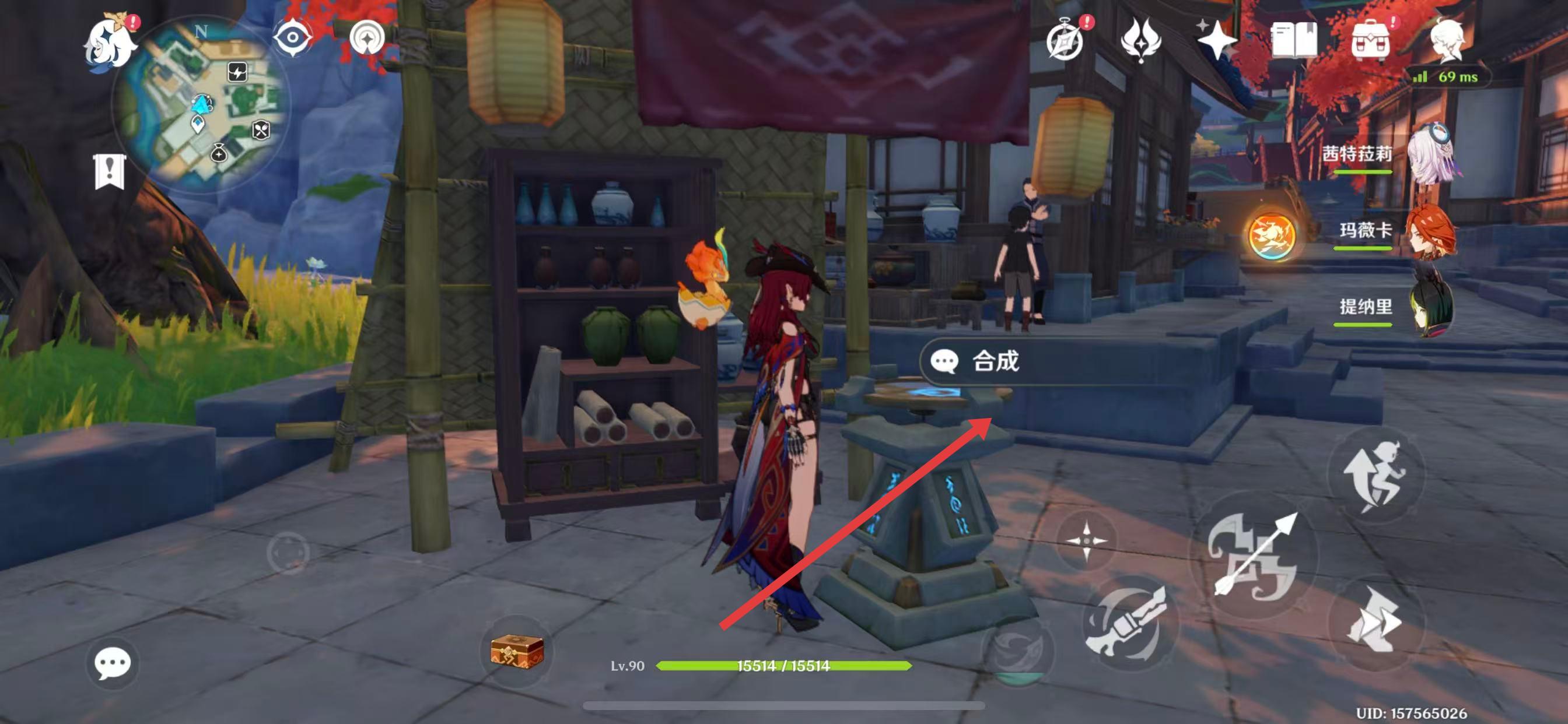 2、到达炼金台所在位置后,靠近炼金台,点击出现的合成交互按钮,进入合成界面。