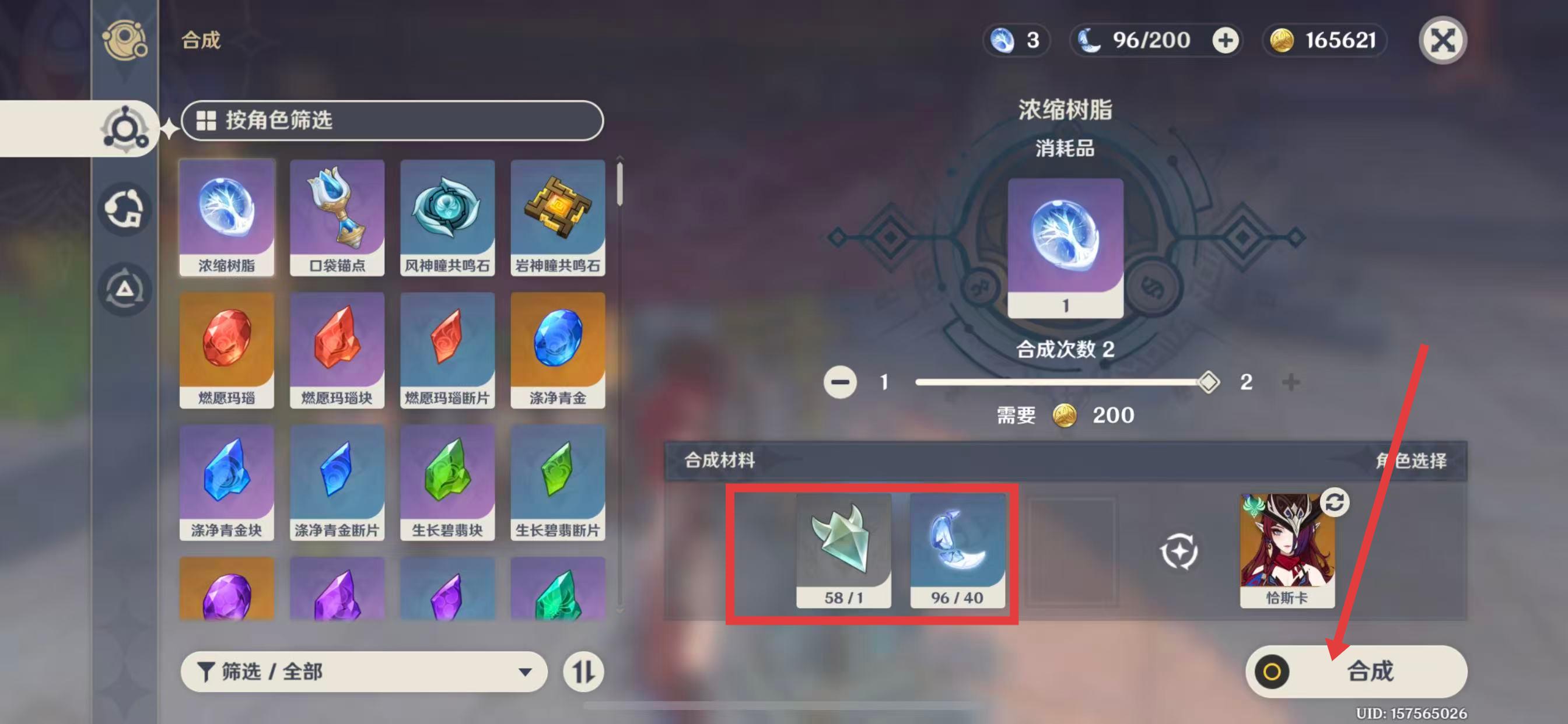 3、在合成界面中,找到浓缩树脂选项,确认合成所需的材料数量足够后,点击右下方的合成按钮,即可合成浓缩树脂。