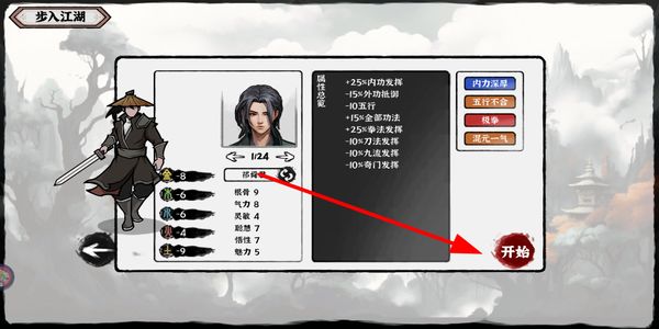 3、完成角色属性与词条的设置后,点击开始按钮,正式开启在武义九州世界中的冒险旅程。