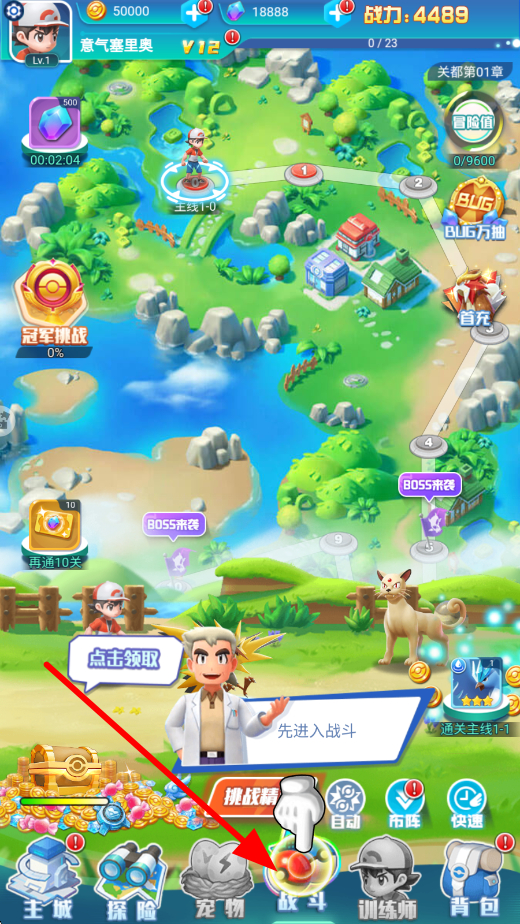 1、主界面点击战斗选项,即可进入战斗场景,与对手及精灵展开交锋,战斗时需合理运用策略,应对不同敌人,提升获胜几率。