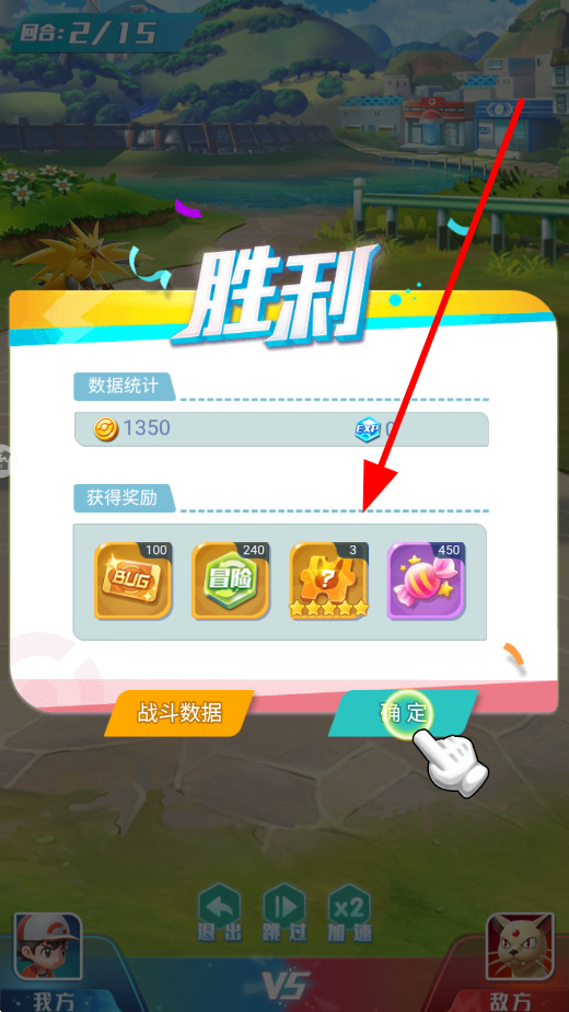 4、成功完成战斗等操作后,显示胜利,展示获得的奖励,包括金币、各类道具等,点击确定,即可领取奖励,用于后续精灵培养等操作。