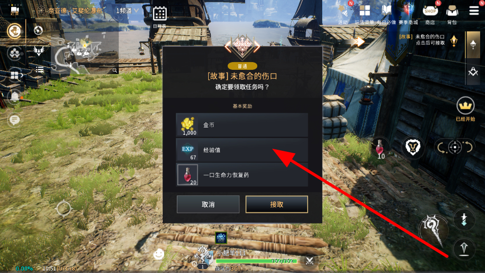 4、冒险过程中,会遇到各类任务,比如未愈合的伤口这类故事任务,接取任务后完成相应要求,就能获得金币、经验值、生命力恢复药等奖励,助力角色成长。