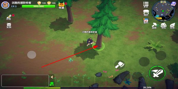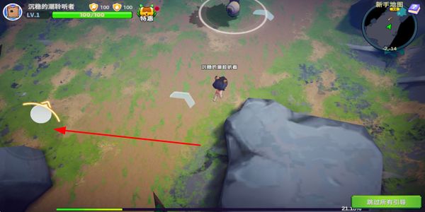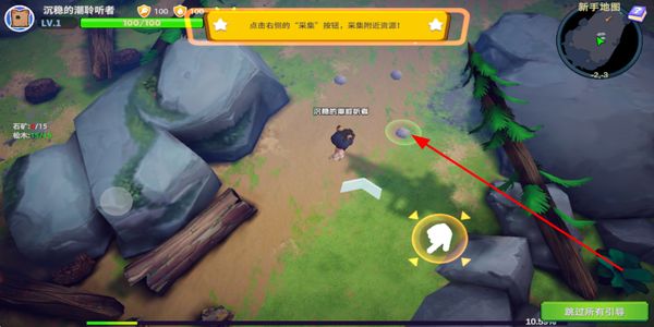 1、操控移动按钮调整角色位置,在新手地图中移动到目标区域,为后续的资源收集做准备。
