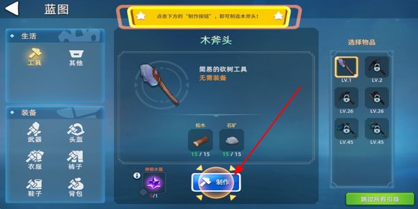 3、进入蓝图界面选择工具分类,消耗收集的材料点击制作按钮,获取木斧头这类工具。