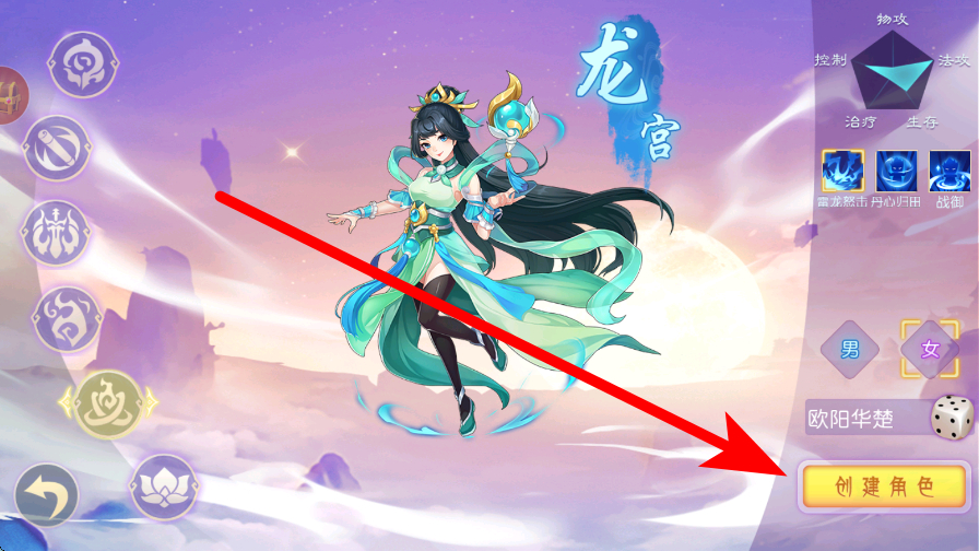 1、首先创建角色,在角色创建界面,可选择龙宫等,然后点击创建角色,打造出属于自己的角色,开启奇幻冒险旅程。
