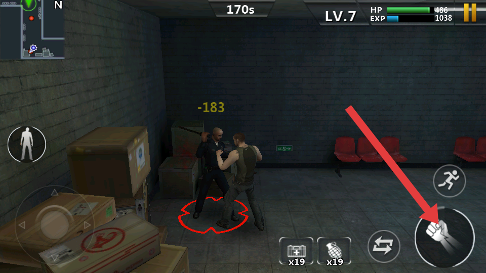 1、进入室内战斗场景后,先关注屏幕上方的生命值与经验值面板,优先熟悉基础操作,点击射击按钮使用枪械攻击敌人。