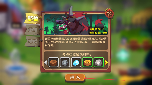 1、在关卡选择界面,查看关卡信息如怪物介绍、消耗精力值、掉落数量加成,点击进入开启关卡。