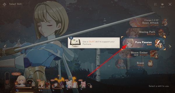 3、技能选择界面,根据提示使用增益类技能,这类技能能为队友提供加成效果,使用时需消耗对应点数。