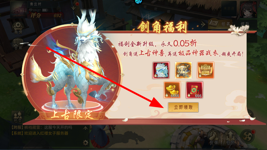 2、创角后,会有创角福利领取,其中包含上古神兽、极品神器战衣等丰厚奖励,点击立即领取,这些福利能为前期冒险提供强大助力。
