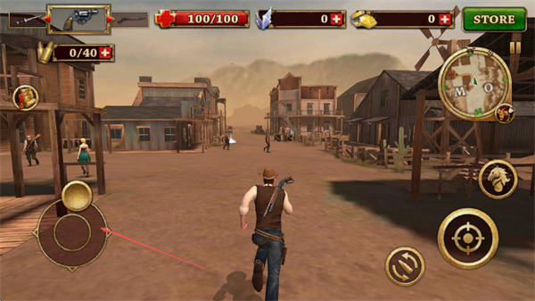1、用左侧摇杆操控牛仔在西部小镇移动,熟悉场景,准备完成任务。