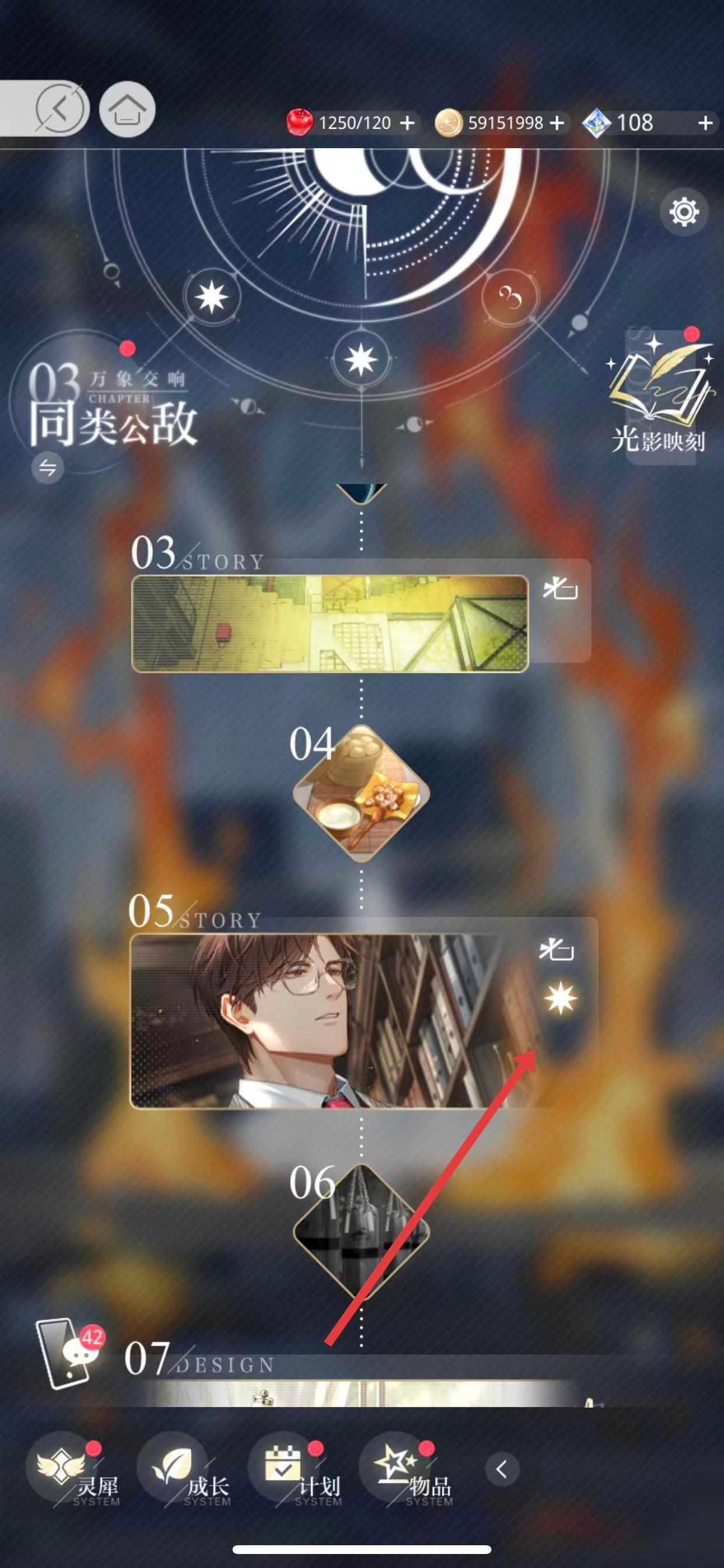 2、在章节剧情选择界面,找到带有太阳或月亮标识的关卡,点击想要重置选择的关卡进入。
