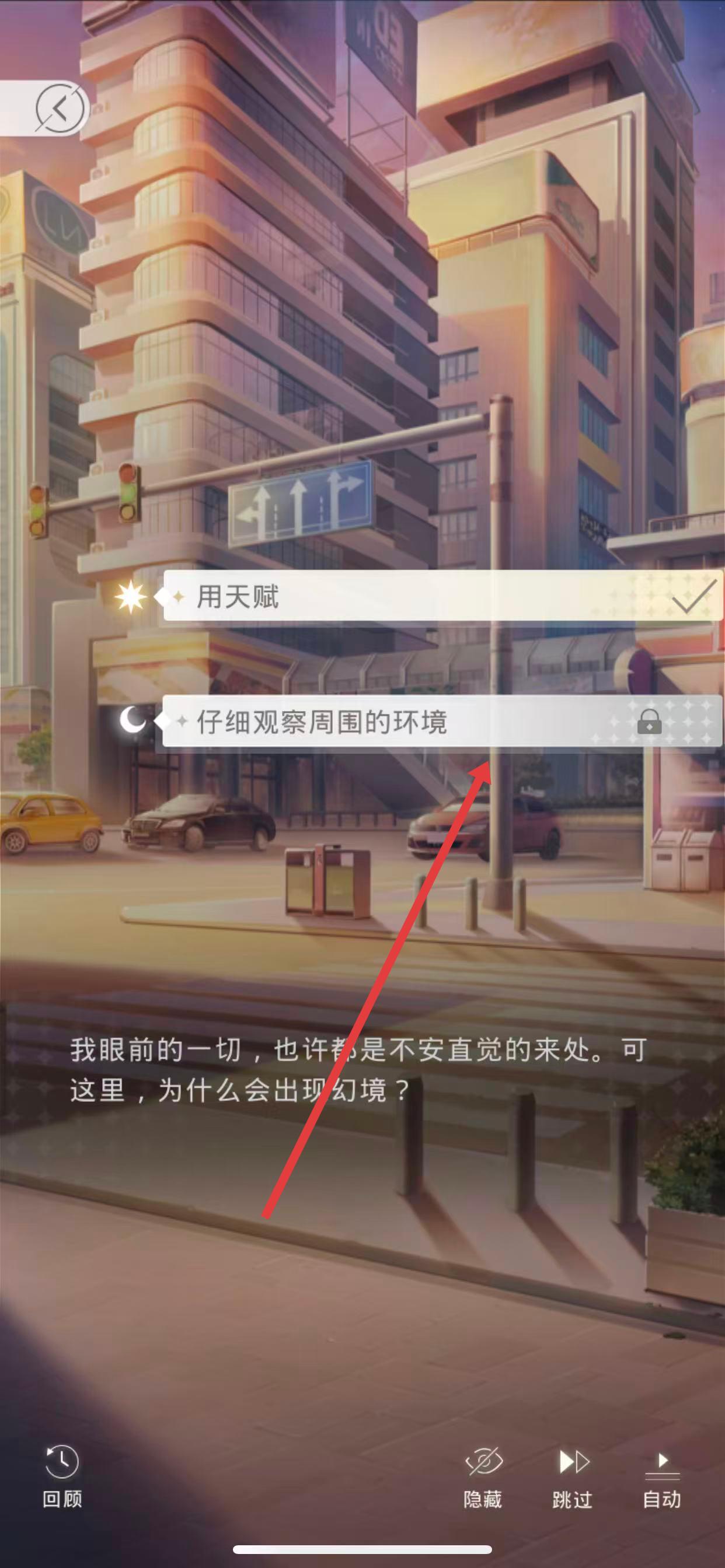 3、进入关卡剧情后,推进到出现光夜抉择选项的界面,再次选择另一个剧情分支选项,以此重置该关卡剧情选择。