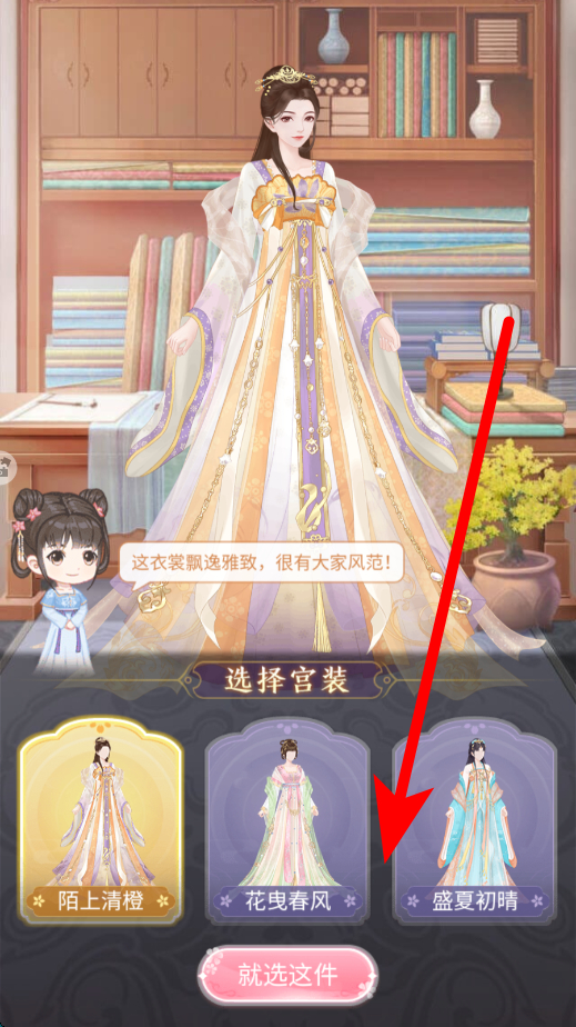 2、打扮角色可选择宫装,有陌上清橙花曳春风盛夏初晴等不同风格的宫装供挑选,选好后点击就选这件,即可为角色换上心仪宫装,打造独特宫廷形象。