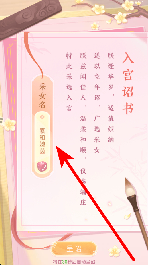 1、创建角色时,会有入宫诏书,其中包含采女名等信息,可了解角色初始设定,为后续宫廷生活开启奠定基础,让角色以特定身份进入宫廷世界。