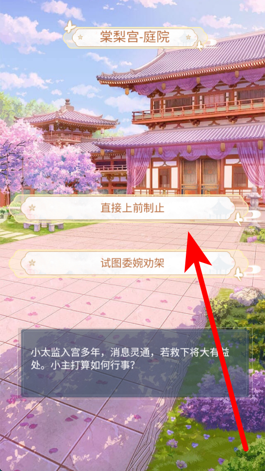 3、主线选择会遇到不同剧情分支,比如在棠梨宫庭院,面临直接上前制止试图委婉劝架等选择,不同选择会影响剧情走向,需根据情况抉择,推动主线发展。