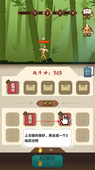 2、把相同等级的武学卡片合成如2级合成3级,解锁更高等级武学,提升战力。
