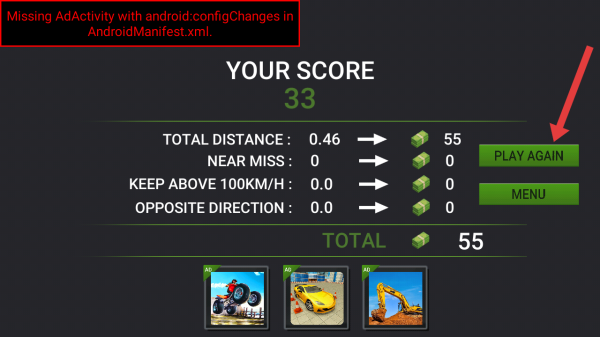 3、如果在驾驶道路上碰撞到其他车辆则失败,结算后点击PLAY AGAIN,重新挑战改关卡。