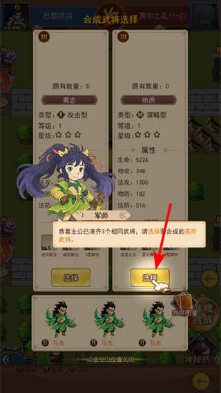 4、当拥有6个相同武将时,点击选择的按钮来合成高阶武将,高阶武将属性更强,这是阵容关键技巧。