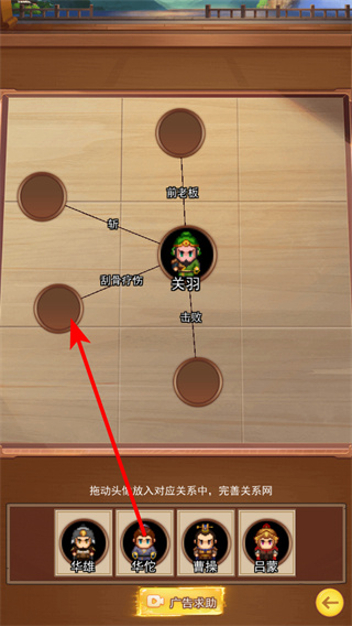 2、在关系界面,依照红色箭头指引拖动武将头像到对应关系位,完善武将关系可解锁增益效果。