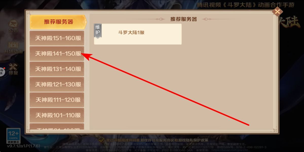 2、来到服务器选择界面,左侧列表陈列着不同天神殿序列的服务器,依据人数、开服时间等按需选适配服务器,选定后点击点击进入,确认进入斗罗世界。