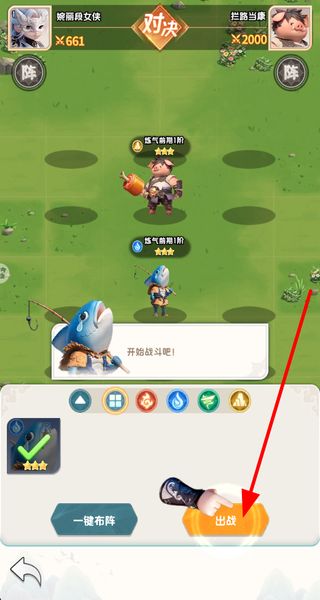 1、对决界面选择角色,通过一键布阵调整阵容,确认后点击出战按钮,开启与敌方的战斗。