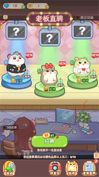 3、点击下方招聘按钮,消耗抽奖券进行员工抽奖,从上方的三个员工中抽取其中一个。