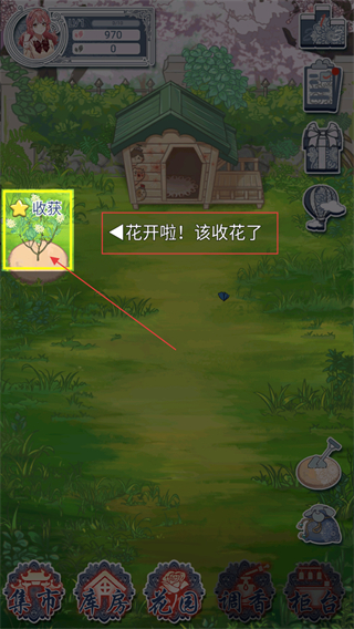 4、当花朵成熟后,点击对应的花朵区域,再点击收获按钮,即可获取种植产出的花朵。