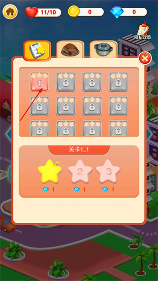 1、点击开始游戏按钮进入游戏,找到关卡选择界面中已解锁的1关卡,点击该关卡进入对应的1-1关卡准备界面。