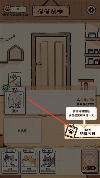 4、安排好猫咪服务客人后,点击结算今日按钮,即可结束这一天的经营,进入次日继续管理猫咖。