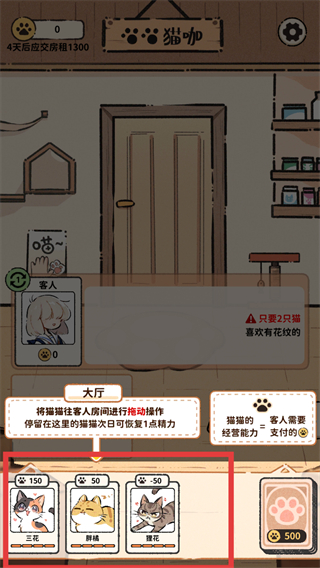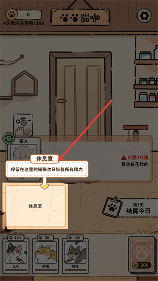 3、当猫咪精力不足时,可将其拖入休息室,停留在休息室的猫咪次日恢复所有精力,以保证后续服务的能力。