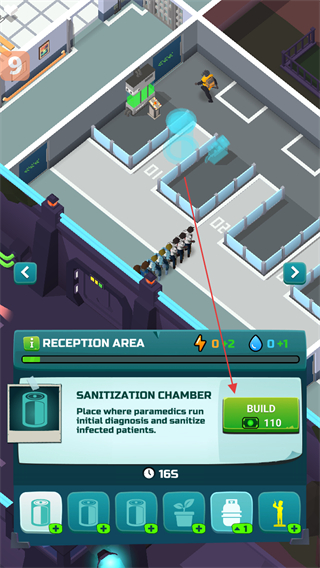 2、在界面中找到SANITIZATIONCHAMBER,点击BUILD按钮花费110资源建造该设施。