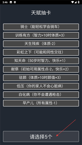 4、从抽卡结果中选择5个增益天赋,确定初始天赋后开启新人生。