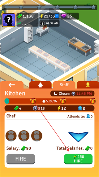 3、在Staff界面,点击HIRE雇佣厨师,增加餐厅的运营人力。