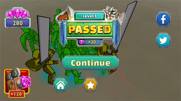 4、战斗胜利后,出现PASSED提示,点击Continue进入下一关,继续挑战。