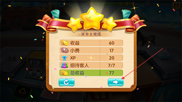 4、关卡完成后,领取收益、小费等奖励,点击箭头按钮进入下一关。