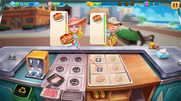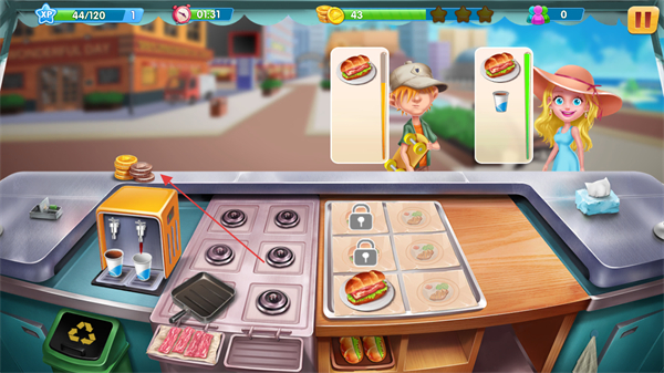 1、明确本关目标收集70金币,根据顾客需求如汉堡+饮品,在操作台制作对应食物。