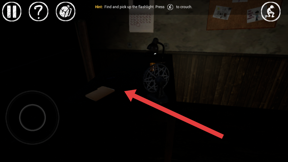 1、在昏暗房间内,朝着箭头指向的桌子区域移动,寻找手电筒等关键物品,这是推进游戏的重要步骤。