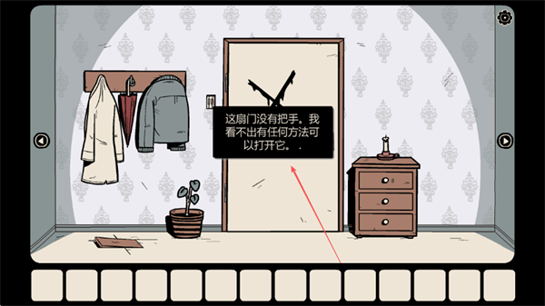 1、观察场景,门无把手无法直接开,收集地面物品,推进解谜流程。